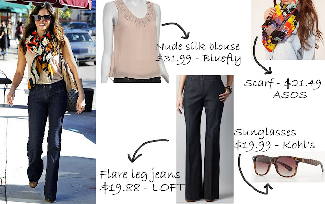 Some girls have it all - beauty, great style and Channing Tatum for husband!! Look at Jenna Dewan aka Mrs Tatum strut her stuff in this casual flare leg jeans, blush blouse and color punching Theodora and Callum's orange multi diamonds tie all art scarf which cost a big $175!